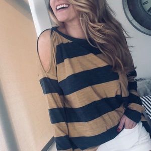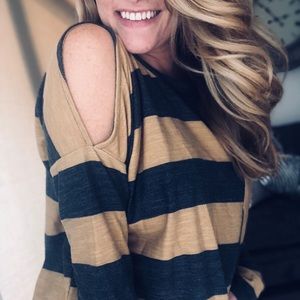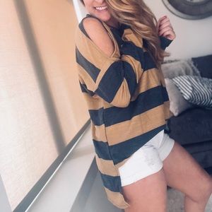 Peekaboo shoulders! We are sold. Our Amy Top is a stripe french terry long sleeve top with open shoulders and one pocket detail. Pairs perfectly with our Ashley Perfectly White Shorts!