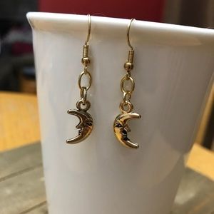 Adorable handmade gold moon dangle charm earrings made with nickel free metal earring wire posts.