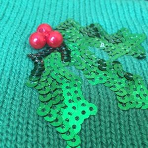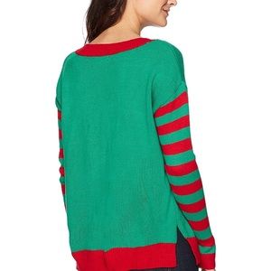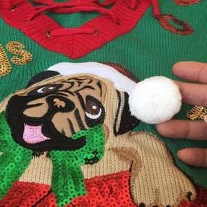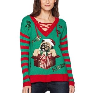 Long striped sleeve v-neck Christmas pullover with lovable pugs and kisses sequined decoration on front