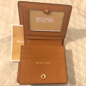 A pebble leather MICHAEL Michael Kors wallet with ID-protective lining. ID window, 5 card slots, and lined cash pocket. Snap closure.