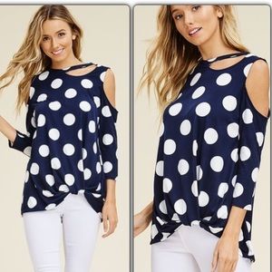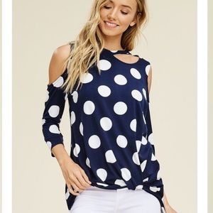 These cute navy polka dotted tees are soft and comfy. A cold shoulder knit tee with a rounded neck and front twisted knot. 95% Polyester 5% Spandex.