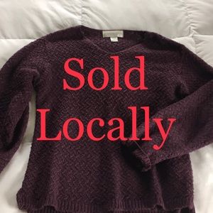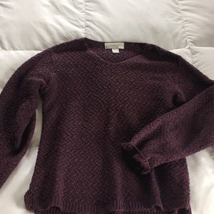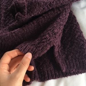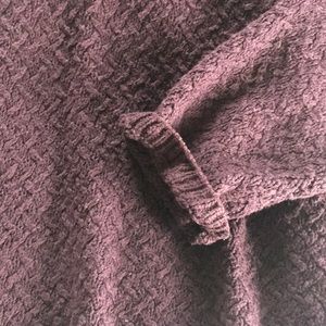 This sweater is a lovely plum color, and has an intricate crossover pattern in the thread. Very warm and cozy!