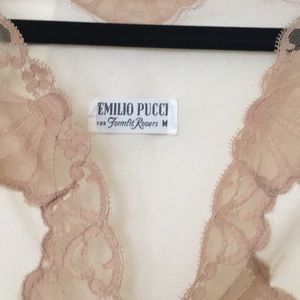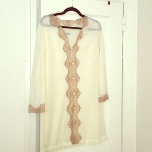 Amazing cream colored button style tunic with nude/tan lace trim. Excellent vintage condition, small mark in back as shown in last photo.