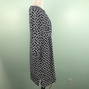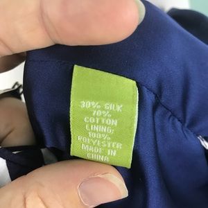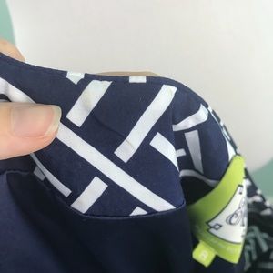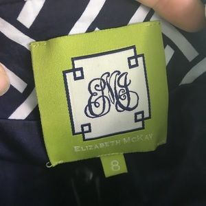 Elizabeth McKay dress. Size 8. Blue & white print with gold tone “buttons” on sleeves. Some light discoloration on inside of dress, see pictures. No other issues noted. Smoke free home.