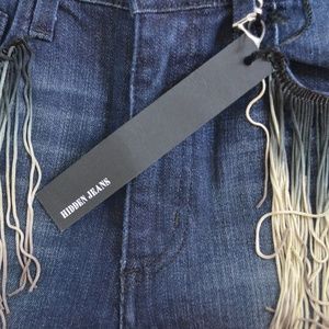 These super short jean shorts have fringe for some added flair. The fringe is ombre going from blue to tan and hangs from the front pockets.