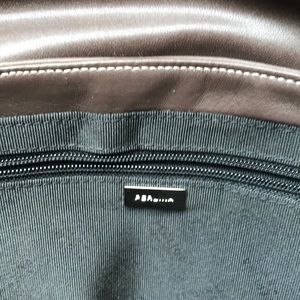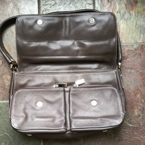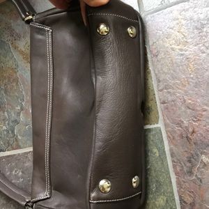 Dark brown chocolate color leather silver hardware one zip lock it inside to slide pockets inside. Footed bottom. Super soft gorgeous bag
