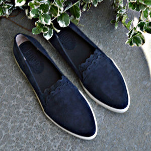 ◇ Casual comfy leather slip on sneaker shoe. Leather uppers with perforation and scalloped trim details. Hidden elastic goring for a great fit. Soft suede will stretch with wear.