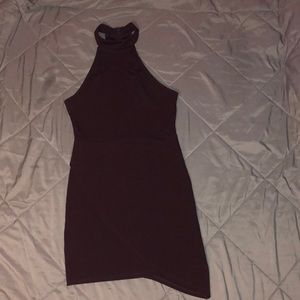 Halter neck, burgundy, asymmetrical fitted dress with some stretch. Perfect for a fun party night