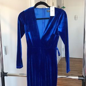 Blue velvet jumpsuit with matching belt