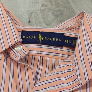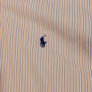 Gorgeous RALPH LAUREN MENS button up shirt! Never worn, gorgeous for casual day time, a fun dinner, or a night out. It’s a classic fit and fantastic light peach and blue in color.
