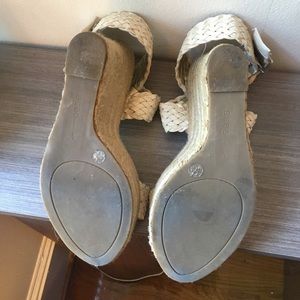 White woven leather straps that go over the toes and around the ankle with buckle closure.