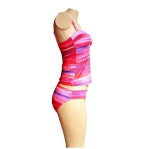 Lauren Ralph Lauren. Top has tie detail in center of bust. It's unlined there so it has sort of a plunge effect. Removable padding at bust. Boning at sides of bust to keep shape. Gathered at sides of bust. Removable straps. Bottoms have materials/size tag removed but when measured out to other pairs, they measure out to an 8. They are brand new. Bottoms fully lined. Metal logo at back.