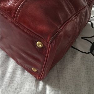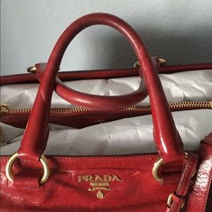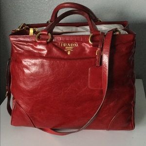 Prada Vitello Shine Tote. Beautiful deep red color with a bit of a shine. Corner and handle wear. Interior 2 separate compartments, separated by a zipper compartment in the middle. Also has two interior zip pockets on each size. Crossbody strap and magnetic closure. Come stuffed to keep its shape, as well as with felt covers for the front and back and dustbag. Purchased in Italy circa 2012.