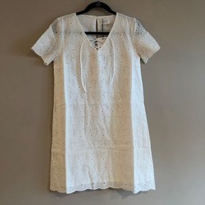 100% cotton English embroidered dress with short sleeves, v neck, and a line cut. Features a lace up neckline, scalloped hem, and keyhole with button closure at the back of the neck.