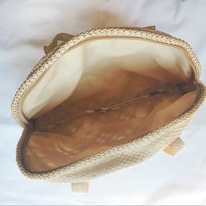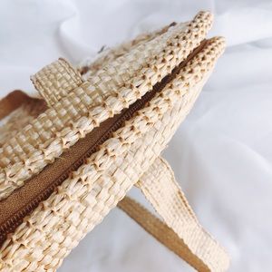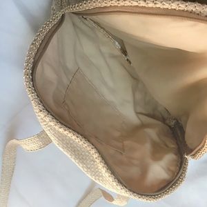 A mix of natural and brown hand woven straw creates this beautiful tote. Lined with a sewn in thin fabric. One pocket inside. Very light and spacious.