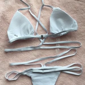 White ribbed strappy bikini. Features removable padding and clasp closure. 30% cotton 65% polyester 5% spandex