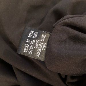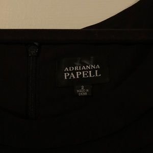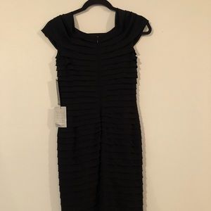 Adrianna Papell Black Scalloped Dress, size 2, new with original tags attached. Dry clean only. Originally purchased from Nordstroms, and never worn. When on, the dress sits roughly two inches below the knee. Somewhat flexible material, mid-weight, lined with a black liner. Slight white blemish on tag, that can’t be seen when dress is zipped.