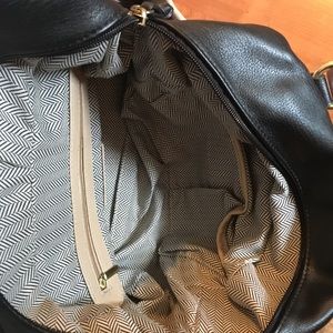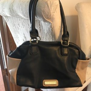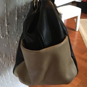 This beautiful Steve Madden super-soft leather handbag has one zippered pocket in addition to two side slip pockets on the outside. Inside there is one zipper pocket and two slip pockets. There is a tiny hole in the lining and several marks from what appears to be a pink marker. This handbag is in VGUC.