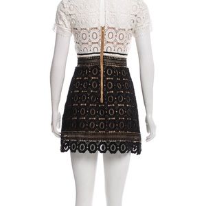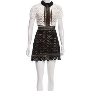 Black and white Self-Portrait short sleeve mini dress with lace accents throughout, point collar at neck, contrasting underlay at interior, exposed zip closure at back and dual hook-and-eye closures at nape, tan lining, fits like a size 2.