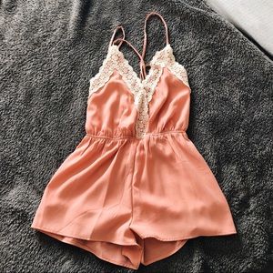 Stunning peach salmon colored romper with crochet lace cream colored flower trim. Only worn twice! Perfect for summer or a night out ✨⚡️