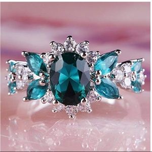 NWT Turquoise Topaz Sterling Silver Statement Ring. stones are a turquoise topaz and cz quartz crystals. gorgeous and delicate style on an eye catching and statement making cocktail piece. .925 silver band.