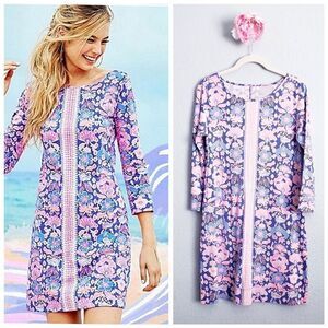 Swirling embroidery and a gathered dropped waist set a whimsical tone for this mock-neck dress that's hiding a skin-baring cutout at the back.