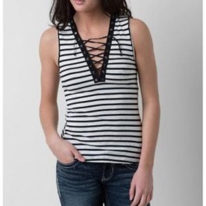 Striped lace up tank top in a size small. Rayon/spandex blend. Hand wash cold.
