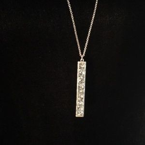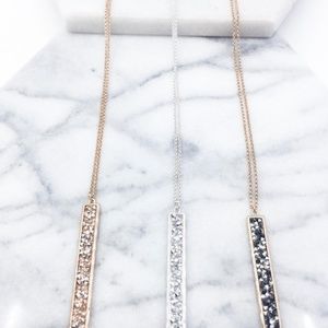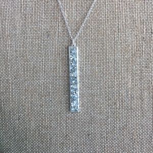 Stunning long necklace in silver tone with silver crushed stone sparkles on the long bar pendant. Wear this with your plunging necklines, sweaters, blouses everything! Measurements are approx chain is 14.5" drop, with 3" extender, bar pendant is 2" I also have this in peach and black sparkles in separate listings. ✅I ship same or next day ✅Bundle for discount