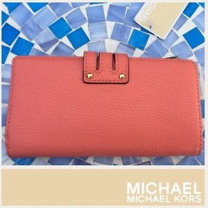 Brand new, super pretty, 100% authentic Michael Kors Ganesvoort T Z Continental wallet is in perfect condition with tags & all original packaging intact! Available in an adorable shade of grapefruit, accented by gold-toned, signature hardware! Made from lightly pebbled genuine leather & featuring a triple prong buckle flap with snap closure, interior center-zip pocket, 11 credit card slots, ID window & 3 bill-fold compartments! Retails at $168! No trades please.