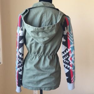 Anorak style hooded jacket green denim body with contrasting knit tribal/Aztec sleeves. Draw stings at waist zip up enclosure with button overlay. Four zippered pockets. Lined interior. Sleeves have a little fuzz (shown in photo)