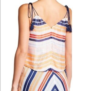 Brand new never been worn with tags attached. Tassel shoulder ties pairs with colorful stripes in a layered midi dress for a casual, yet elegant everyday look. V-neck. Sleeveless Adjustable self-tie shoulder straps. Back hidden zip and hook-and-eye closure. Allover print. Tiered construction. Self/lining: 100% polyester. Imported. This style fits true to size. Comes from pet/smoke free home.