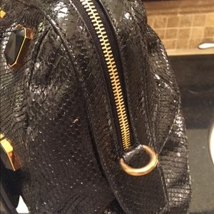 Black python shoulder bag with gold-tone hardware, jeweled front and interior zip pocket with top zip closure. Dust bag included. Very Good. slight tarnishing at leather Shoulder Strap 22”, Height 10”, Width 14”, Depth 4”