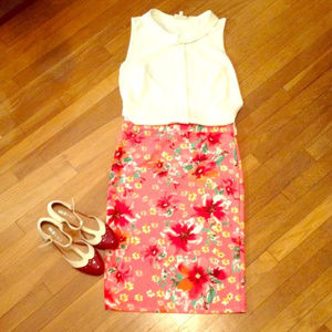 Black bandage skirt highlighted with two white stripes near hem. BodyCon. 80% polyester/20% rubber. Unworn. It’s a great skirt for the office and could easily be tweaked for after hours fun! Shirt not included in listing. Falls past knee.