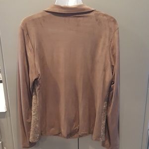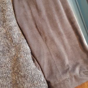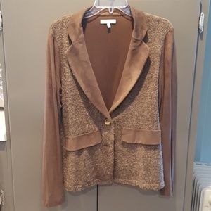 GUC. Sweater jacket with suede like detailing. Faux pockets. On left arm seam is stretched; however, can easily be repaired (see last picture).