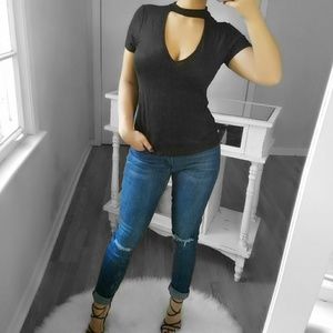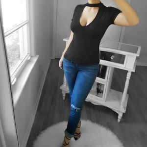 Soft, stretchy and sexy this top features choker high neck detail, plunging v-neckline and backline, short sleeve and a soft and breathable fabric. Looks amazing with jeans! Perfect for date night or girls night out