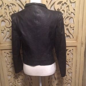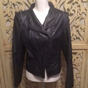 Dark Navy, almost black faux leather moto cropped jacket with asymmetrical zipper. Zipper allows jacket to be styled multiple ways. Jacket is fitted. Made in Paris.