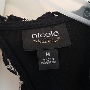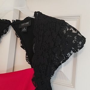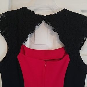 Lovely red and black cocktail dress with lace shoulders. Extremely comfortable material with a zipper closure on the back. The lace closes at the top of the back with a simple black button.