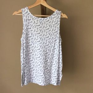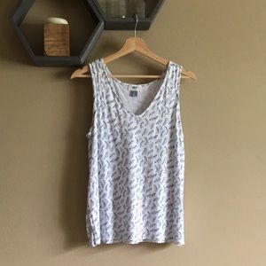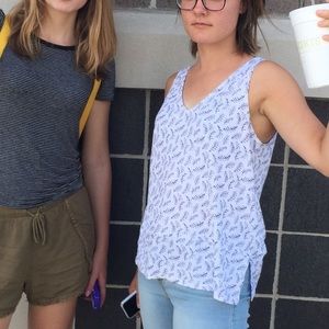 A sweet little v neck tank with fun side slots, a drop waist, and navy blue frond print. It is a little shorter than most of old navy tanks but itโs not quite a crop top - I included a photo of myself for reference, please excuse my face ๐ Only sign of wear is a very light stain on the back, as pictured.