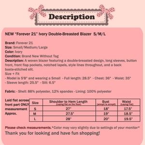 A woven blazer featuring a double-breasted design, long sleeves, button front, front flap pockets, notched lapels, style lines throughout, and a back baste-stitched slit.