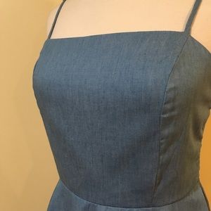 Flattering fit and flare style, light wash denim style chambray, with a flirty open, strappy back design.