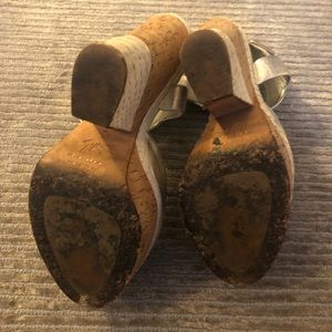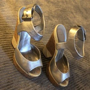 Giuseppe Zanotti wedges, leather silver, cork, and white skin. Size 8. Open toe. Comfortable.