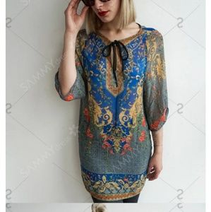 Bohemia V-Neck 3/4 Sleeve Printed Lace-Up Dress For Women - Blue - M.