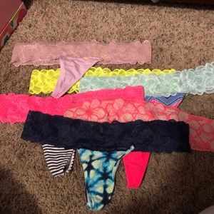 Super cute thongs from PINK. There are 6 thongs, all of which are size Medium except one which is size Small. The thongs feature lace on the waistband. Never worn!