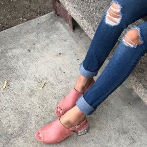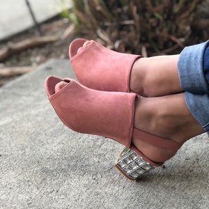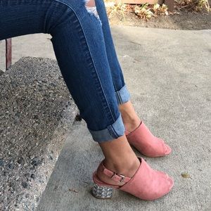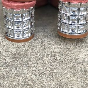 Adorable Peep toe low block heel sandal pink. The heel is bedazzled with block diamonds. Sling back closure and very cute and comfy to walk in. Dress them up or casual out. Also in blue.