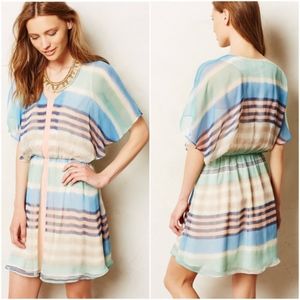 Anthropologie Meadow Rue Decatur Striped Dress. Gorgeous dress in watercolor stripes of blue, green, ivory and pink. Pretty pleated detail down the middle, elasticized waist, and wide, flowy kimono flutter sleeves. Fast ship.