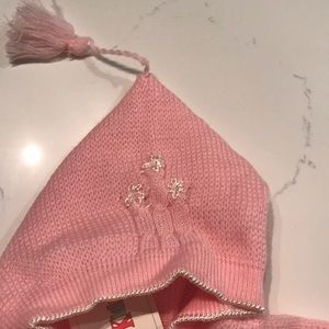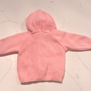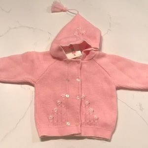 Pink sweater with hood. Buttons on front and flower details. Tassel on hood. Never worn.