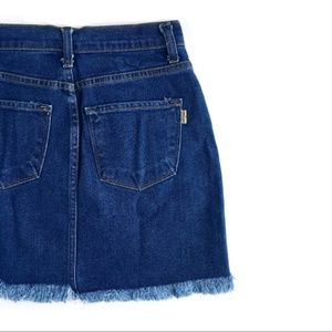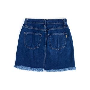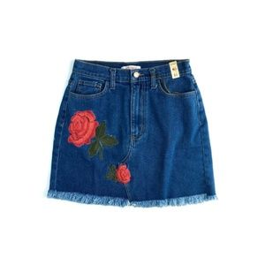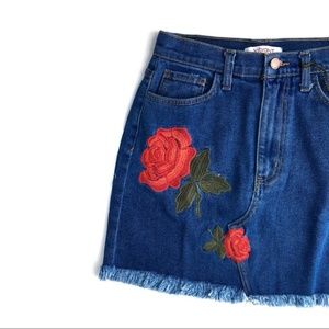 Floral simplicity with this gorgeous royal-wash denim skirt, featuring a rose embroidered appliqué and a raw-edged hem. Functional front and back pockets, high-waist fit. Proudly made in the USA. Size M, measures approx 13" waist, 16" long. Brand new, NWT. Please feel free to make an offer, bundle for greater discount, or ask any questions! :)