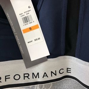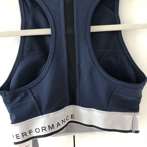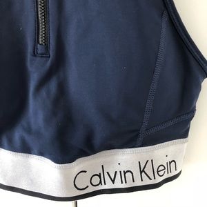 Sexy Calvin Klein sports bra in navy and silver! High neck fit, zips all the way up the front for comfort getting on and off. Calvin Klein name on the band.