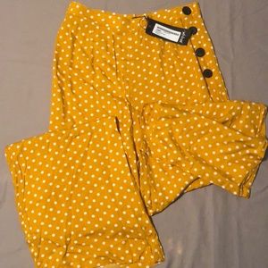 The Weak Spot Pants feature a polka dot design, high-waisted, relaxed, wide-leg silhouette, and decorative buttons and zip closure at side