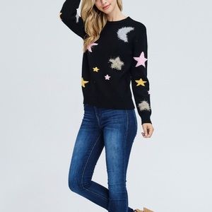 Long sleeve, crew neck black sweater with stars & moon design with some silver fuzzy threads. Very soft 50% acrylic, 30% viscose, 10% polyamaide & 10% polyester. So cute!